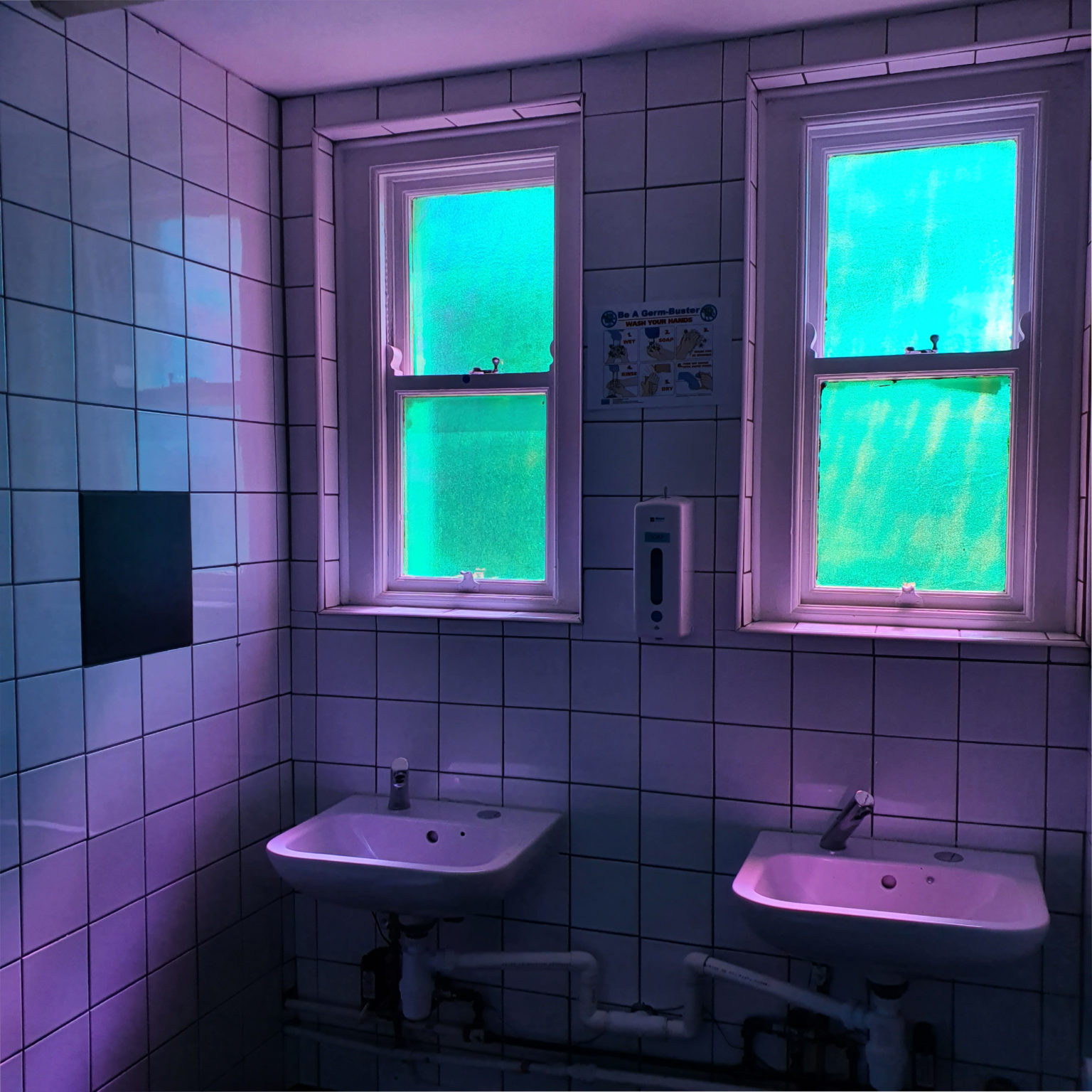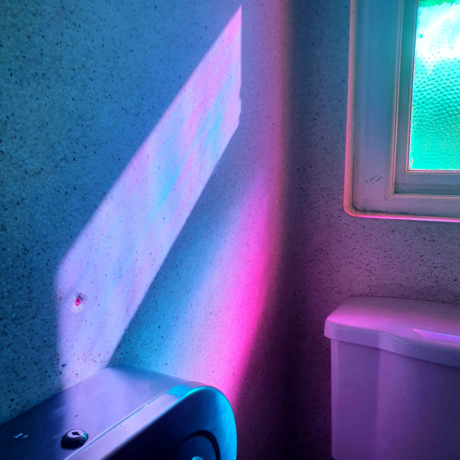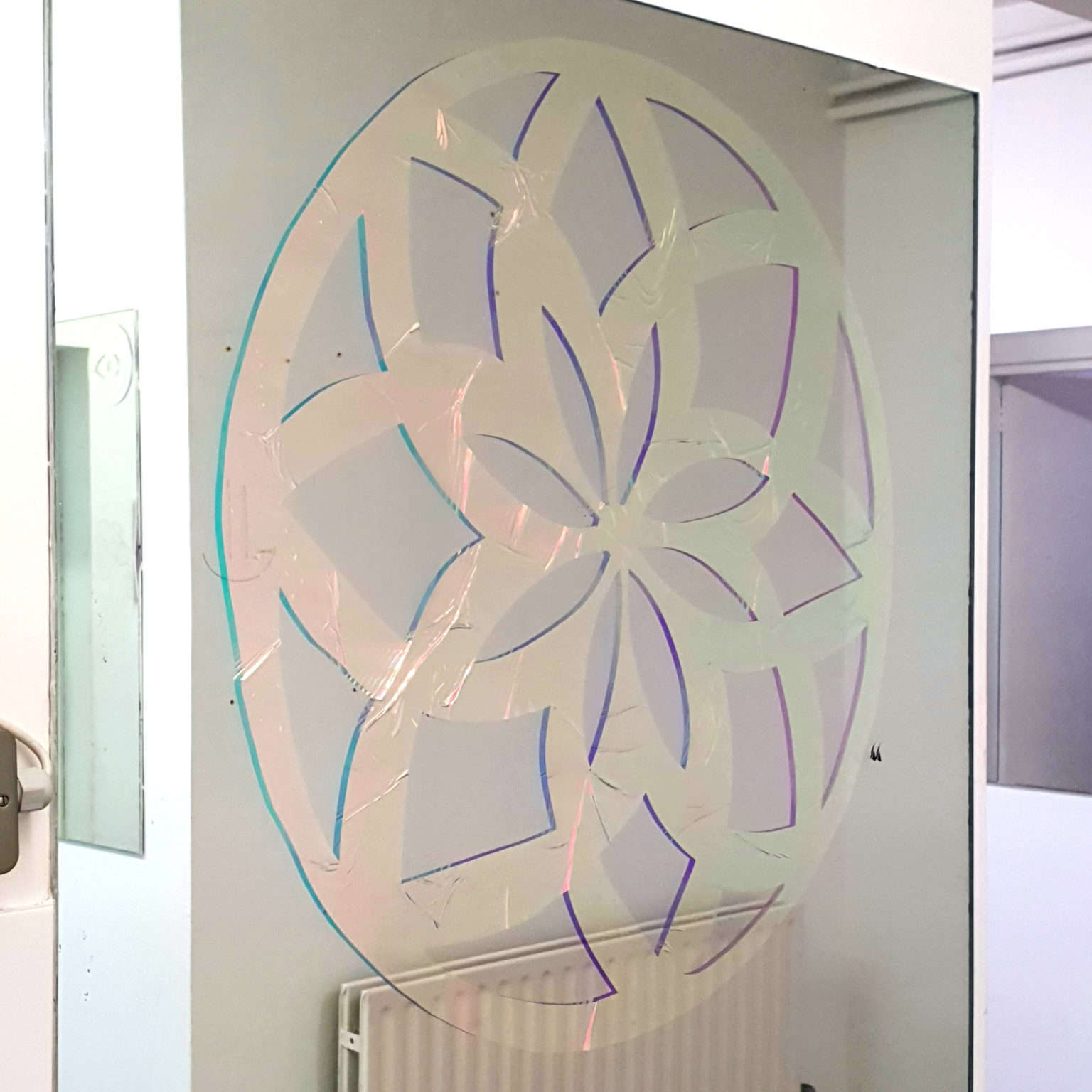 My project explores how art can make a connection to the transcendent, offering an invitation to the divine by transforming mundane spaces. As an aspiring art therapist, my mission is to help people and encourage healing through the medium of art. Kandinsky taught us that the artist’s thoughts and feelings, when translated into art, have the power to affect the spiritual climate of their society. He believed that the artist is obligated to use their talent to make a positive impact, helping humanity toward collective enlightenment. In my project, I have used iridescent film to cover the windows of several college bathrooms, creating a colour-change effect that allows the unknown to shine through. These subtle yet impactful interventions aim to uplift the viewer and prompt a sense of awe and wonder. The audience is caught off guard and can experience a sense of the spiritual somewhere entirely unexpected.