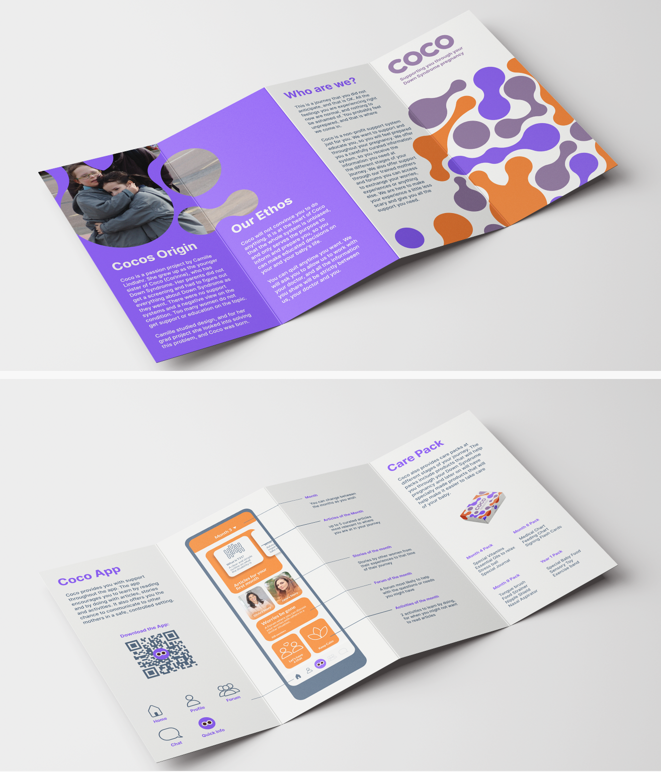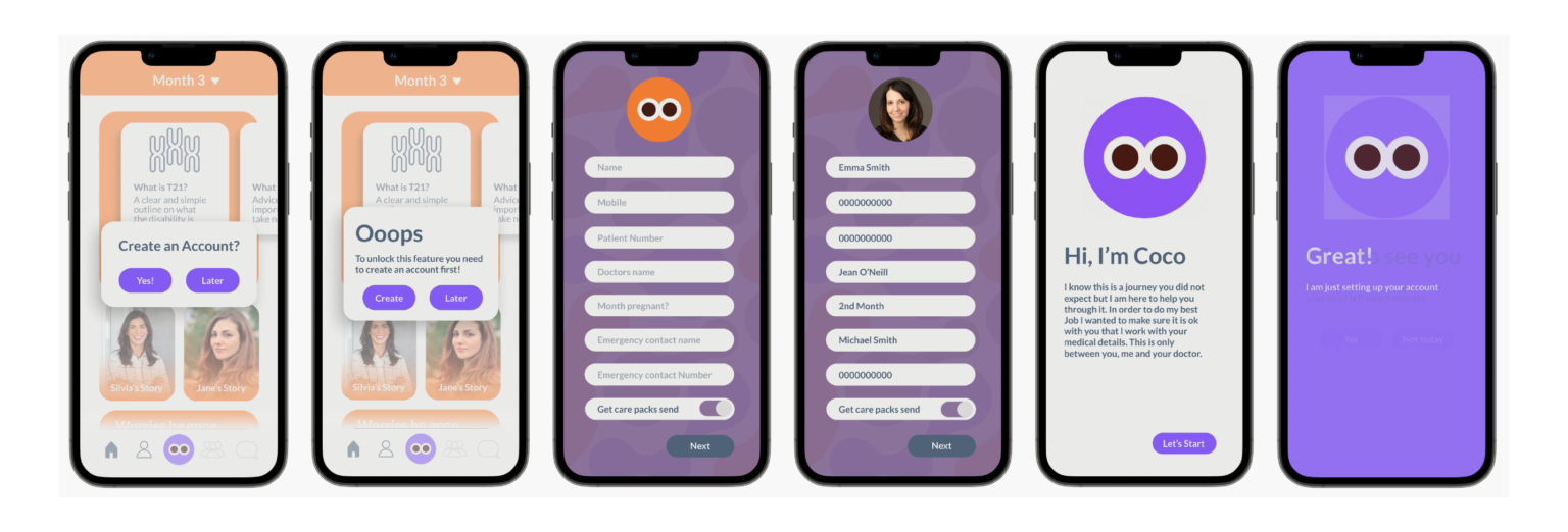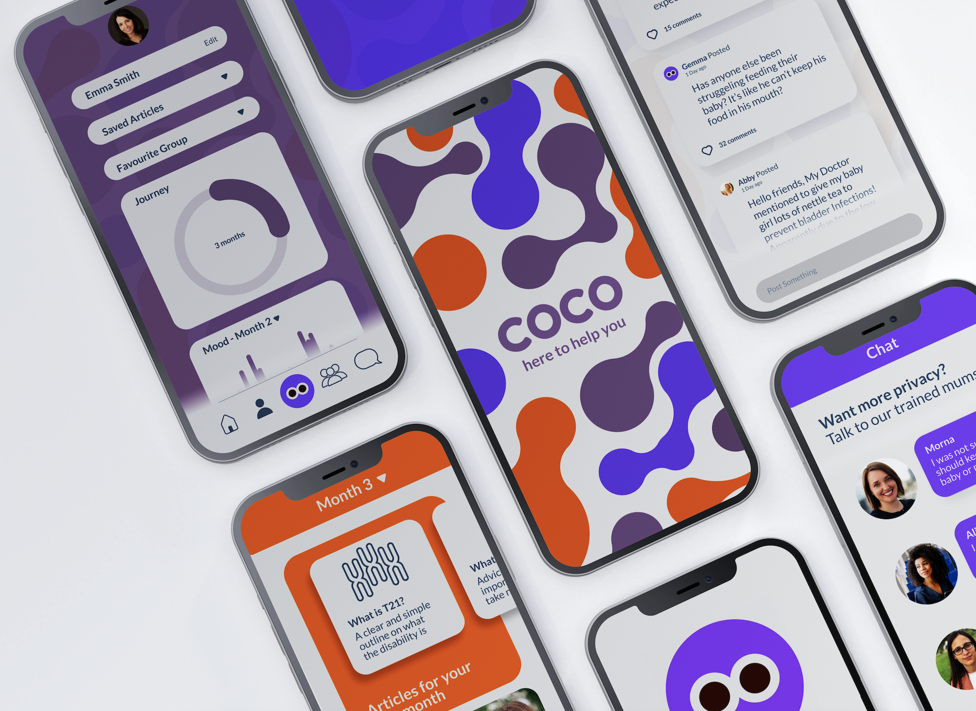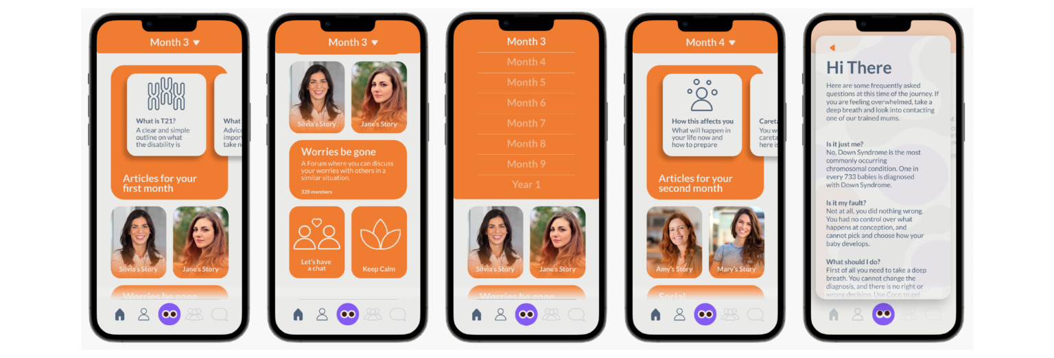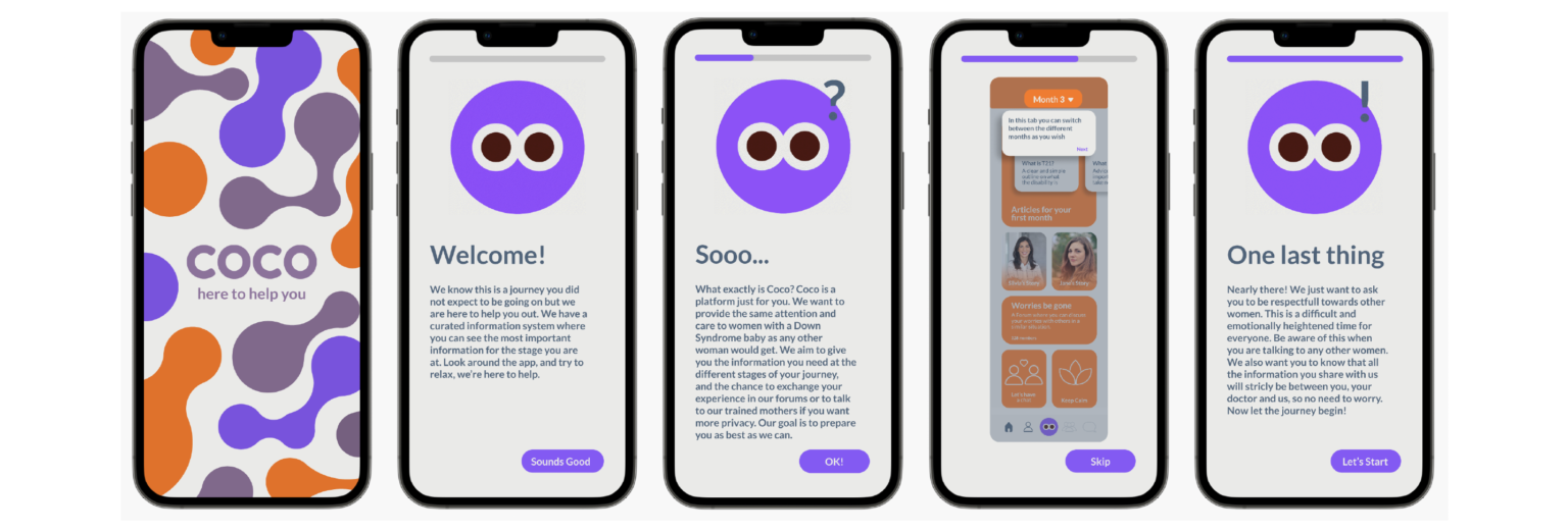 Coco is a non-Profit organisation. It is aimed at women who found out their baby has Down Syndrome. With an App, the goal is to educate and prepare these women, so they can make educated decisions. Coco is non-biased, It will not convince anyone to keep or not keep the baby, the goal is to offer education in a welcoming and safe environment, with non-conflicting and curated information. The information is divided up in order to not overwhelm the mothers and provide them with the information most needed at the different stages of their pregnancy. Coco also offers the chance for the women to discuss their feelings and experiences in a monitored forum, that offers various different groups. For a more private chat, Coco also offers the chance to have a one to one chat with trained mothers of down syndrome children. In addition, Coco also offers various different care packs to be sent out with items that can help out the mother, specified for her needs.