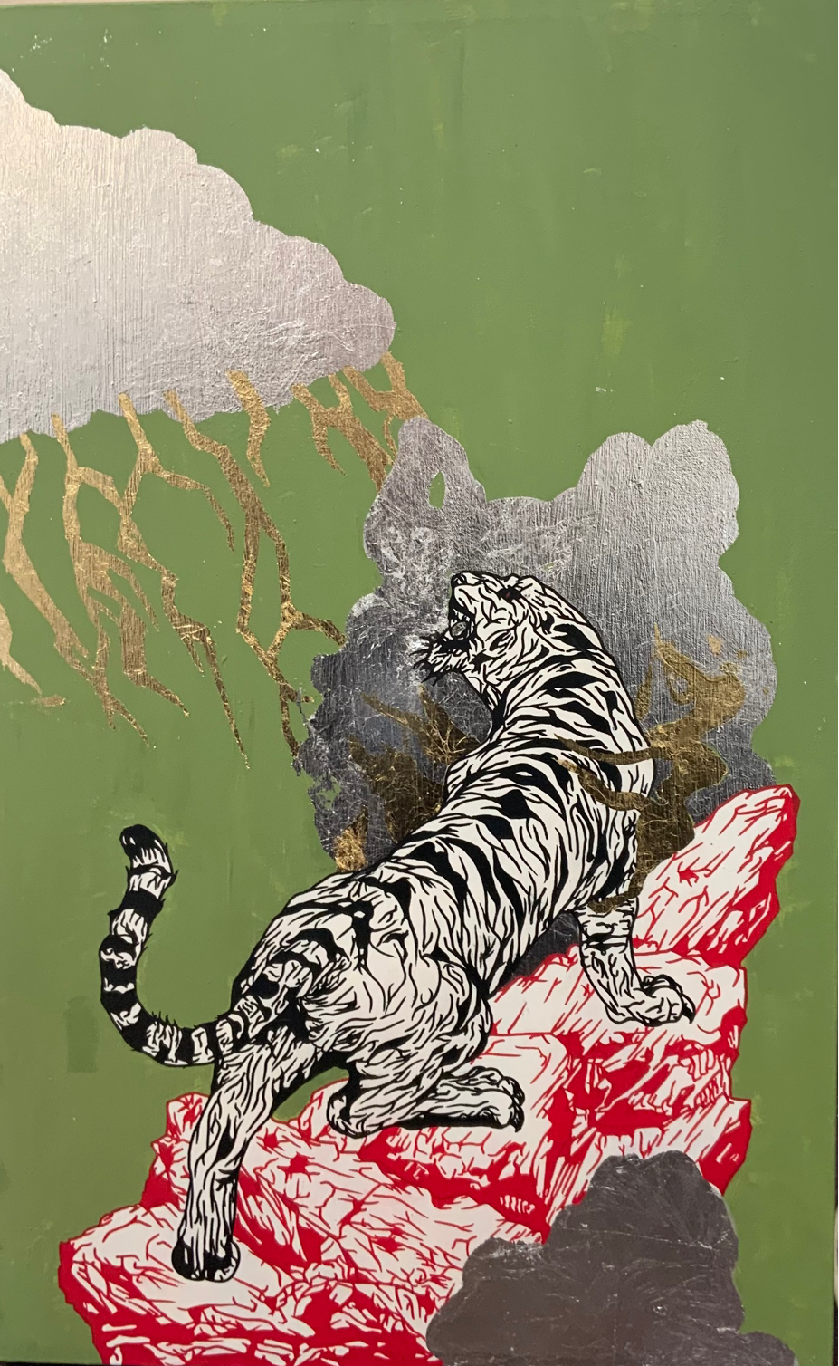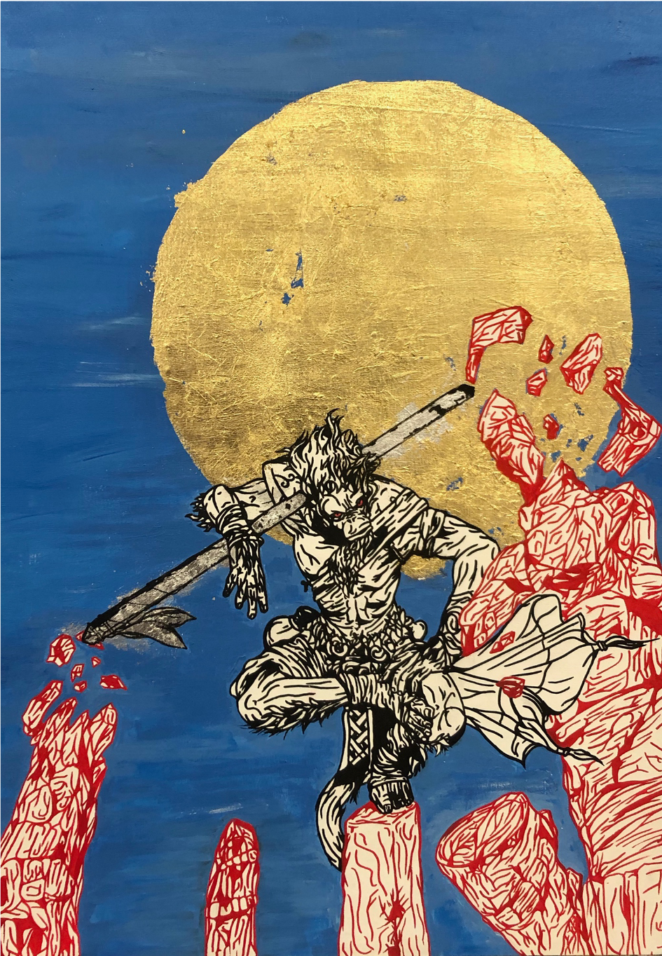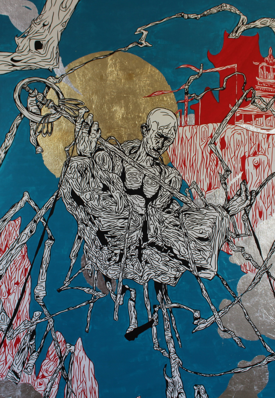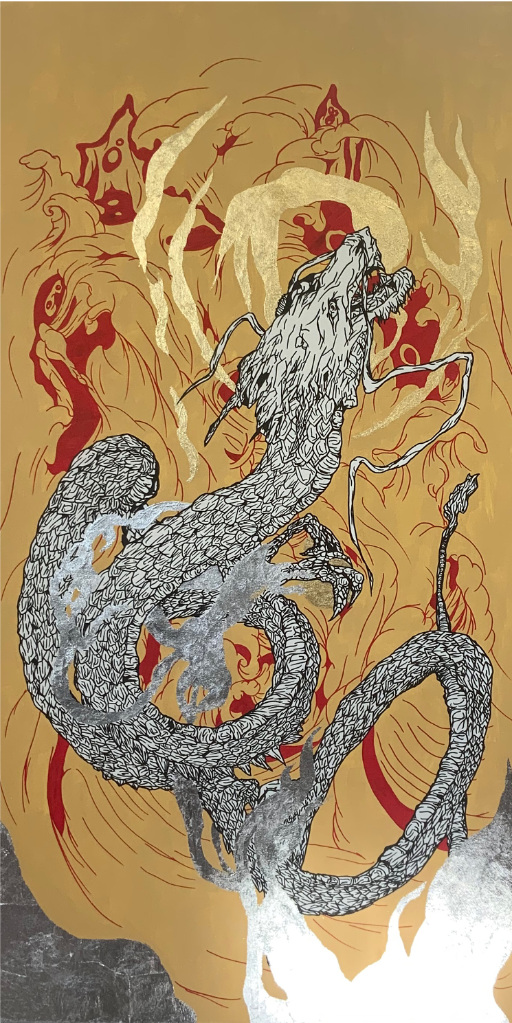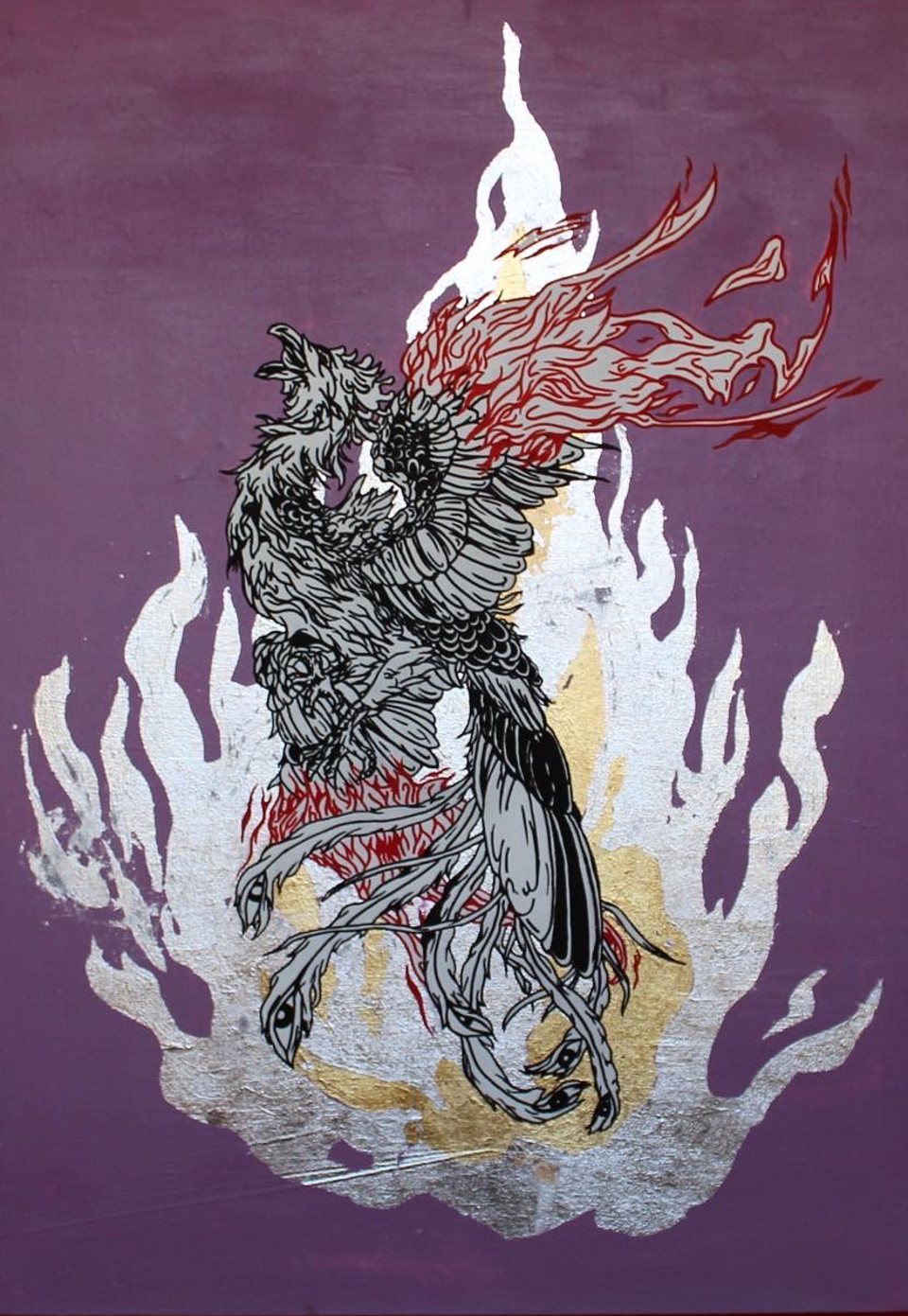 Cian Butler is a young artist who uses a focus on paintings to create unique characters. His favoured subjects are that of mythical creatures drawn from Chinese influence. He uses acrylics with gold and silver leaf to elevate the characters that he creates. This allows for the blocks of colour and the strong line work to be much stronger. With strong influences coming from comic-books and graphic novels.