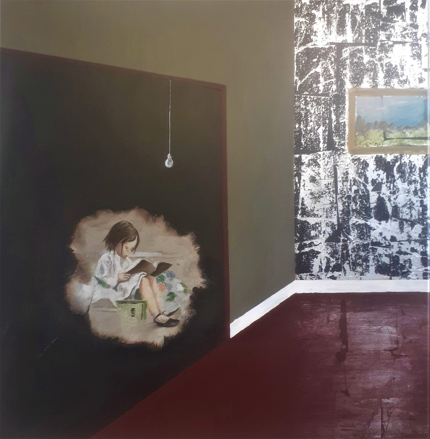 My compositions require close attention, guiding the viewer towards the theme. I apply many layers of paint, so these layers can be rubbed back to reveal the undertones to achieve the required mood. The faces that appear in my compositions may be cold or warm, sometimes with their bodies twisted, and the perspective altered to create unease. Some of my pictures have been cut to reveal a second picture, perhaps involving an object to suggest the inner world of the subject.