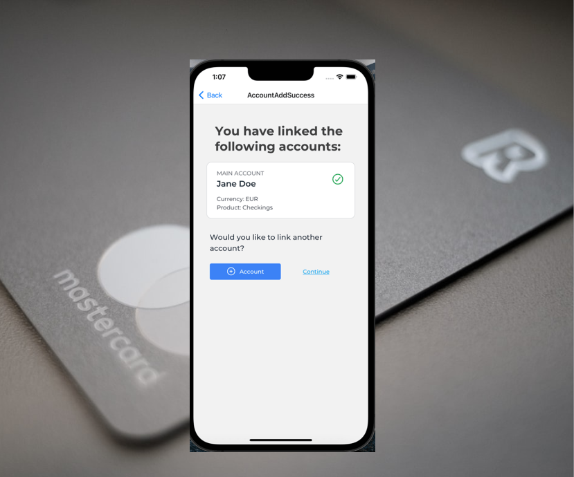 The user is then provided with feedback to say they have successfully linked to their bank account. They are then provided the option to link another account or continue to the app.