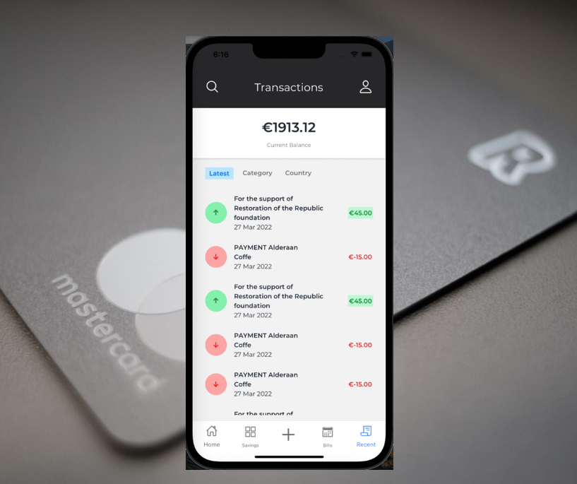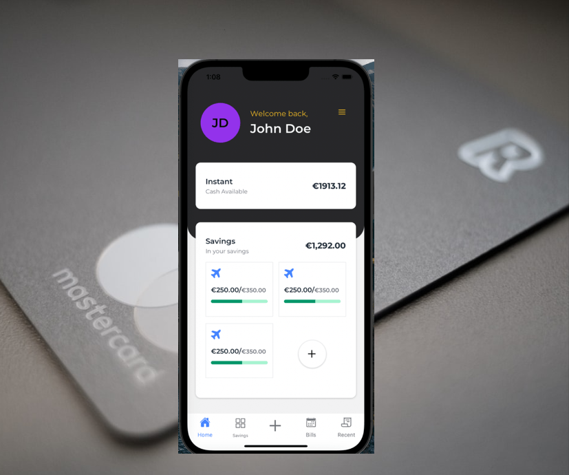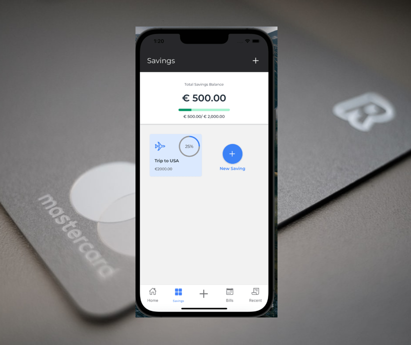 Once the user has logged into their account, they are brought to the home screen. This is where they can see the balance of their account, switch between their accounts and view a portion of their saving goals. A bottom tab navigator was adopted to provide the users with an easy navigation process. From here, they can navigate to their savings list, bills, and transactions and they can add a new item such as a saving goal.