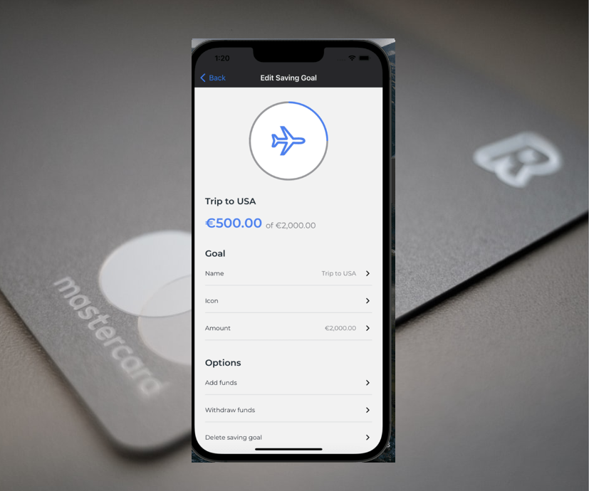 When a user taps on a saving item, they are brought to the saving information screen. This is where the information of the saving item can be viewed. This is where the user can update the saving’s name, icon, amount, etc., and perform certain actions for the saving like adding or withdrawing funds from the saving.