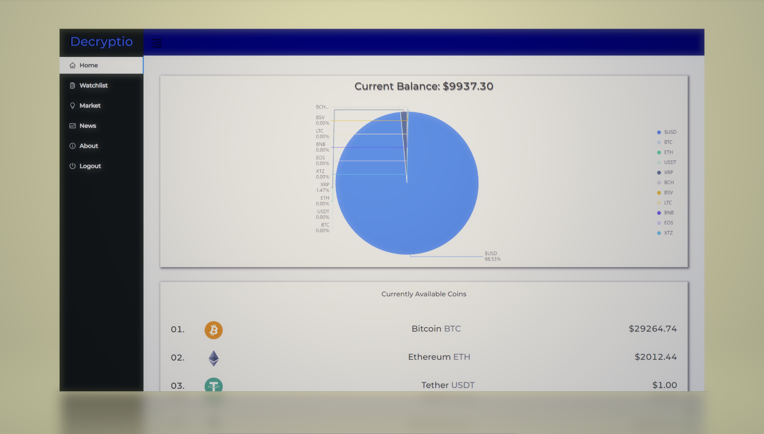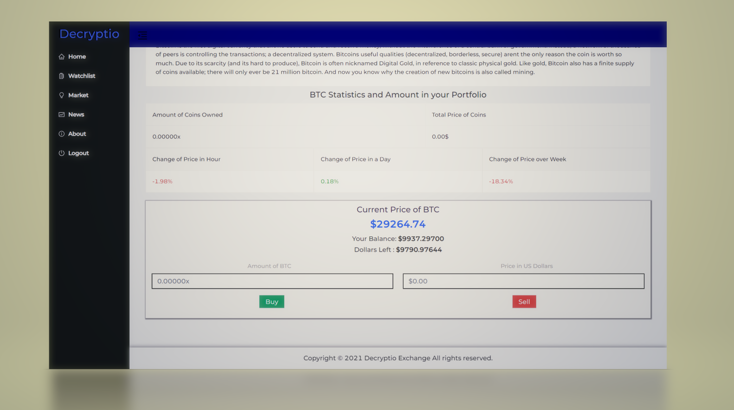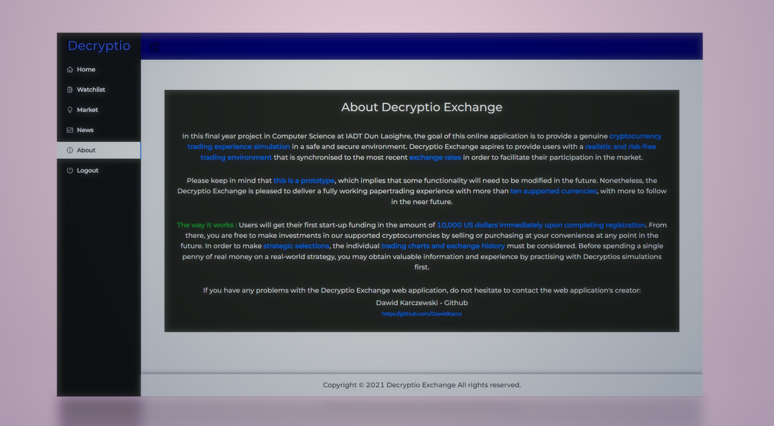 In this final year project in Computer Science at IADT Dun Laoighre, the goal of this online application is to provide a genuine cryptocurrency trading experience simulation in a safe and secure environment. Decryptio Exchange aspires to provide users with a realistic and risk-free trading environment that is synchronised to the most recent exchange rates in order to facilitate their participation in the market. Users will get their first start-up funding in the amount of 10,000 US dollars immediately upon completing registration. From there, you are free to make investments in our supported cryptocurrencies by selling or purchasing at your convenience at any point in the future. In order to make strategic selections, the individual trading charts and exchange history must be considered. Before spending a single penny of real money on a real-world strategy, you may obtain valuable information and experience by practising with Decryptios simulations first.