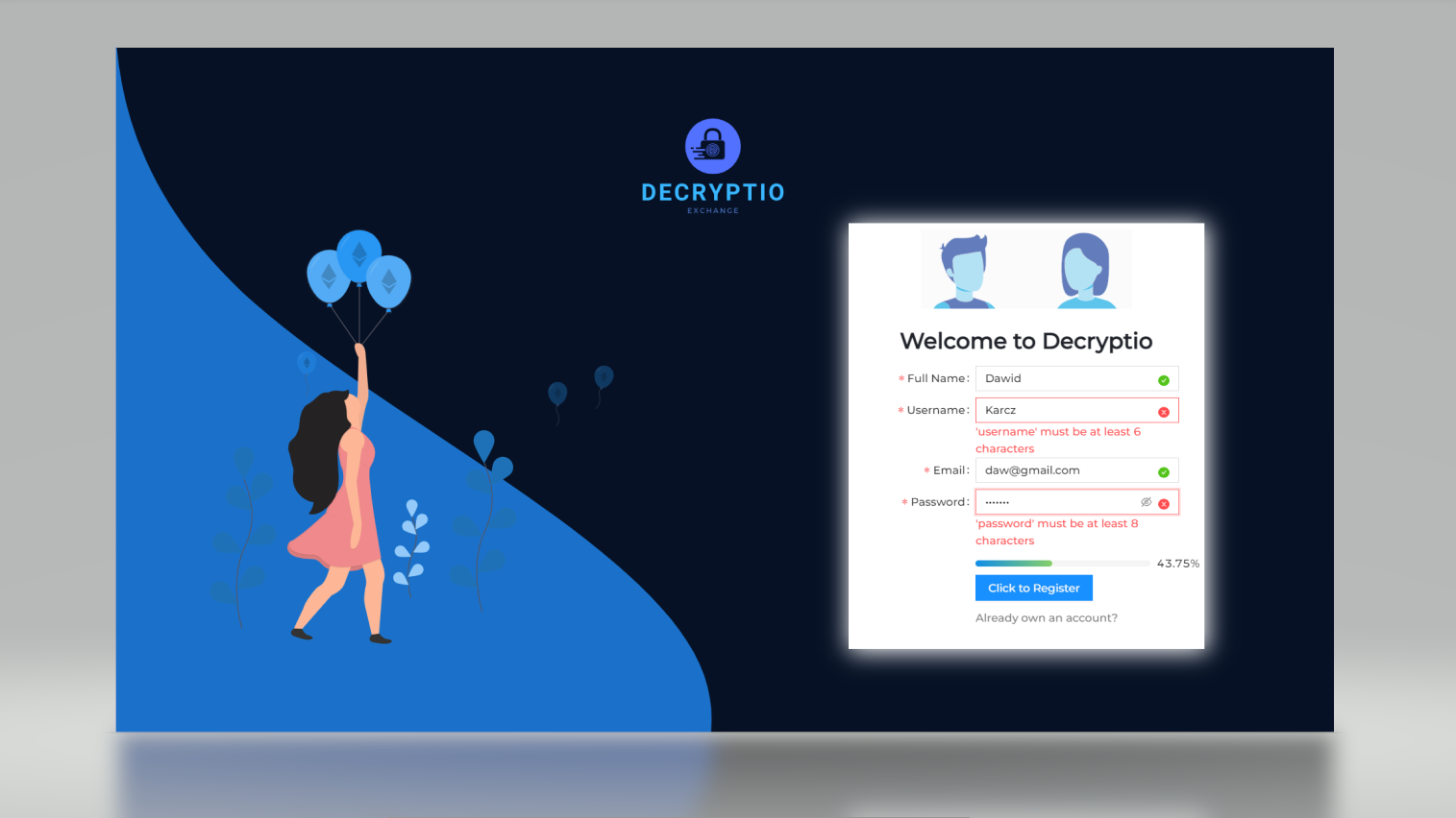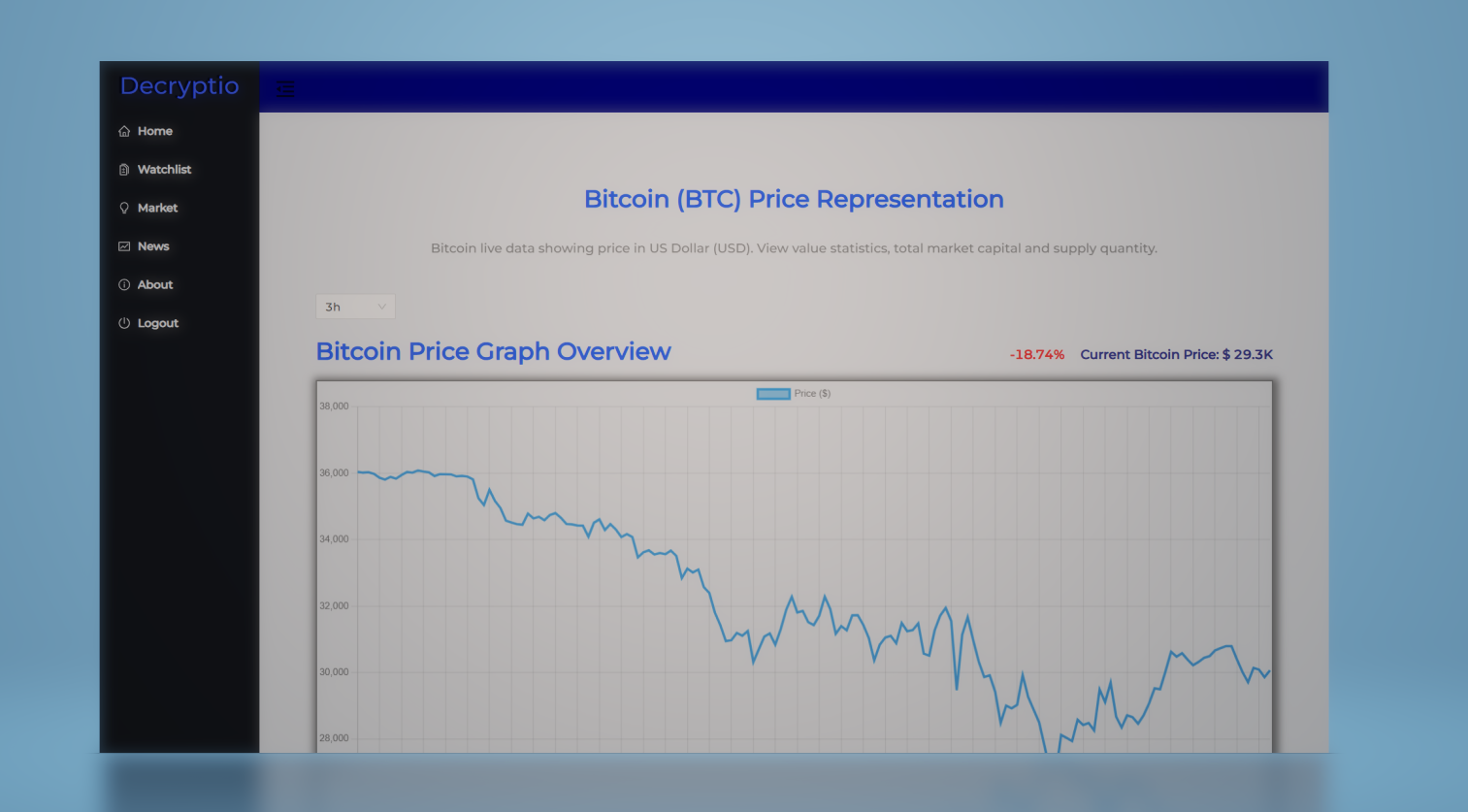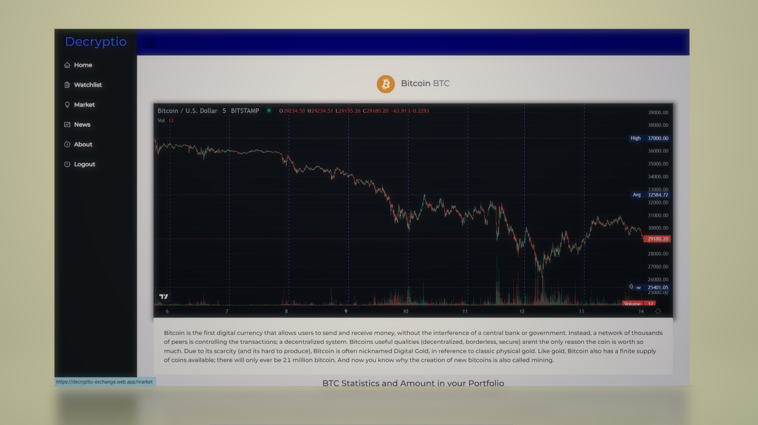 In this final year project in Computer Science at IADT Dun Laoighre, the goal of this online application is to provide a genuine cryptocurrency trading experience simulation in a safe and secure environment. Decryptio Exchange aspires to provide users with a realistic and risk-free trading environment that is synchronised to the most recent exchange rates in order to facilitate their participation in the market. Users will get their first start-up funding in the amount of 10,000 US dollars immediately upon completing registration. From there, you are free to make investments in our supported cryptocurrencies by selling or purchasing at your convenience at any point in the future. In order to make strategic selections, the individual trading charts and exchange history must be considered. Before spending a single penny of real money on a real-world strategy, you may obtain valuable information and experience by practising with Decryptios simulations first.