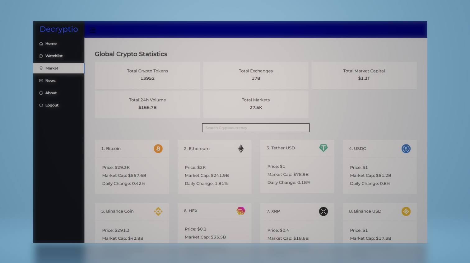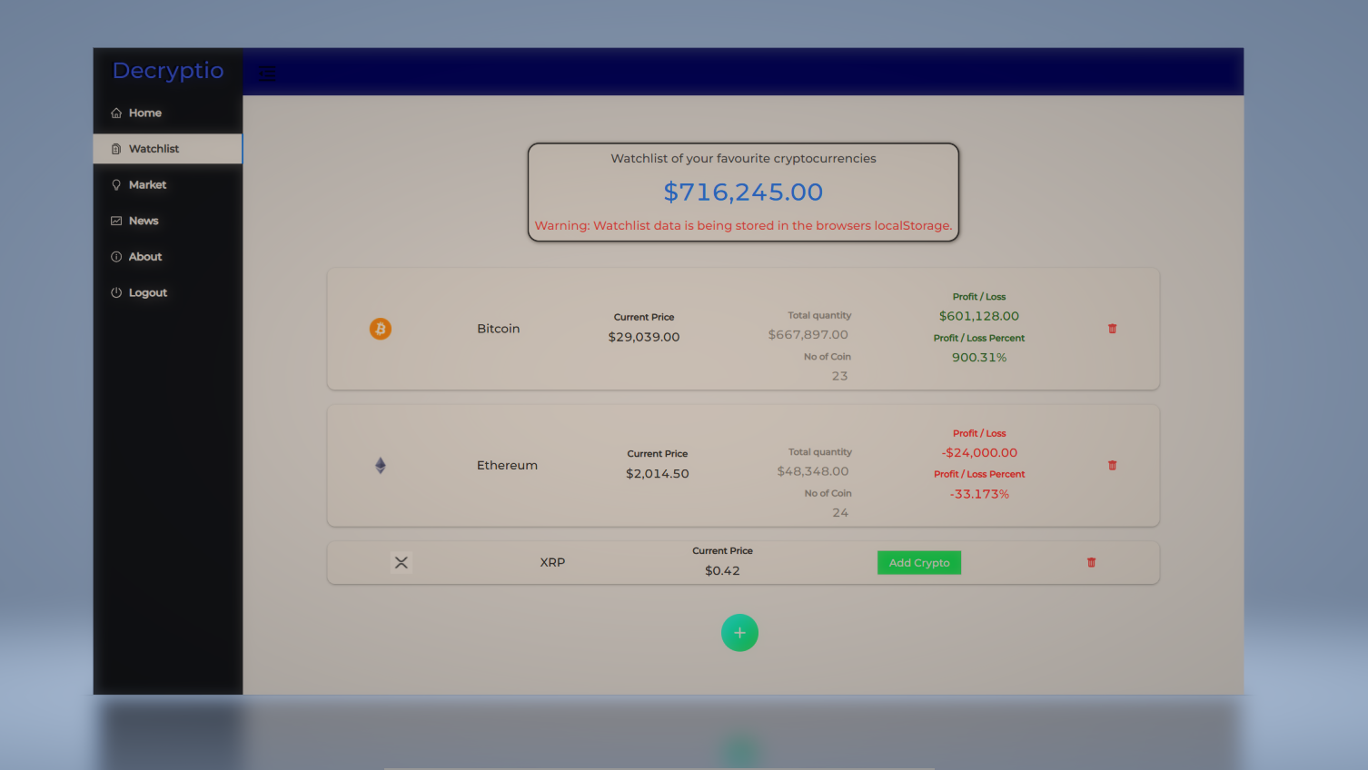 Watchlist Page: The Watchlist portion of the application is a tool that enables users to track the price fluctuations of their preferred cryptocurrencies. The top 100 cryptocurrencies are listed on the cryptocurrency market. Using a watchlist, users can quickly pick and compile a list of currencies they want to track. Users may use all coins from over 600 worldwide crypto exchanges effortlessly. The watchlist is simple and expedient to use. The watchlist page features a header container that calculates the total worth of the cryptocurrencies added to the watchlist. This number varies every time the user adds or removes crypto coins from the list and is set to $0.00 by default. When a user clicks the green plus button, a list of available cryptocurrencies shows on the screen. Users may then utilise the search bar or the currencies mentioned below the search bar to search for their preferred cryptocurrency. When the user selects a coin from the list, the coin is added as a cryptocurrency listing to the website. The next stage for users is to enter the cost and quantity of coins they have acquired using the Decryptio Exchange application or other online exchange platforms. The crypto coin listing will then display the number of coins added and the corresponding price. Profit and loss are also shown in US dollars and as a percentage. This might fluctuate based on how much the user paid for the coins and appear in green as a positive value or red as a negative value. This unique strategy then allows users to compute their watchlist portfolio to see how much they have earned or lost throughout the trading process. The watchlist retrieves real-time data from the cryptocurrency API and presents it on-screen. Whenever the market exchange rate fluctuates, the corresponding change would be shown on the watchlist page.