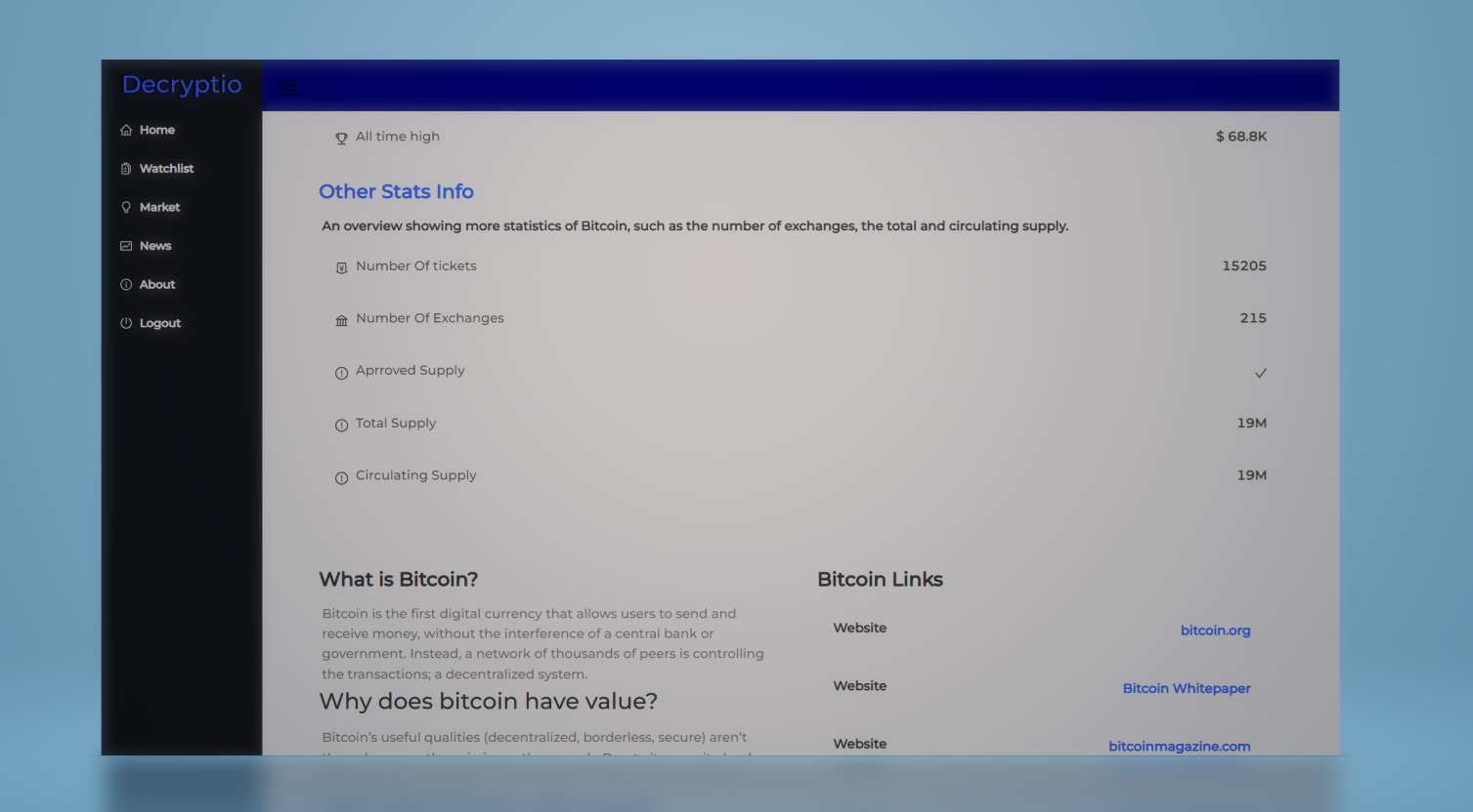 Home Page: Immediately upon registration or login, the user would be sent to the application's homepage. The homepage of the Decryptio programme provides users with access to their cryptocurrency assets. When a user creates a new account, the account initially contains just US dollars and no cryptocurrencies. The user's cryptocurrency portfolio is shown in the form of a pie chart. The pie chart depicts all the cryptocurrencies the user presently has, and the user may choose which coins to display. This might be achieved by removing all other cryptocurrencies from the pie chart, leaving just the ones the user prefers. When a user signs in, the data is retrieved from the database and shown on the application's front end. Additionally, the homepage includes a list of presently accessible cryptocurrency coins that have been added to the service. The cryptocurrency coin list includes a list of eleven cryptocurrencies, each of which is accompanied by its logo, name, symbol, and most current exchange rate price. On the back-end server, this data is also retrieved via the cryptocurrency API and the REST API. The users are then able to click on the listed cryptocurrencies to be led to the crypto information page for that particular currency.