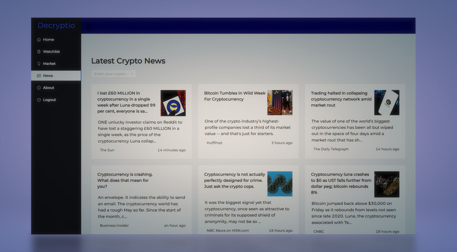 News Page: The news page provides access to the most current news items published on different online news sources. The news information is obtained via the Bing News Search API. The live news data retrieved from the API enables the user to gain knowledge and understand what is occurring in the cryptocurrency market right now. When a user clicks on one of the news cards shown on the website, they would be taken to the actual page of the new article it has been put on in a new browser window. The most recent 24 hours of news are presented; however, if fresh news is uploaded, the page and data obtained from the API will instantly update it with new news information. Additionally, people may search for certain kinds of news they want to read. They may do so by clicking the drop-down menu and selecting the news category they want to see. This then modifies the news shown on the website to reflect the news that users want to be presented.