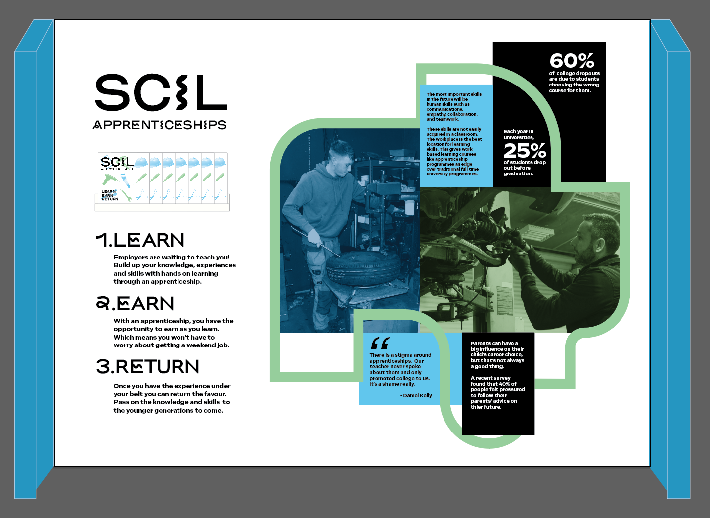 Highlighting an alternative after school education. With hands-on learning and the exploration of new skills and experiences, apprenticeships should be encouraged inside and outside of the classroom. Focusing on the elements that represent the apprenticeship experience like typographic expressions, graphic images, and photography all work alongside each other to tie the promotional campaign together and help tell the audience that an apprenticeship is worth consideration.