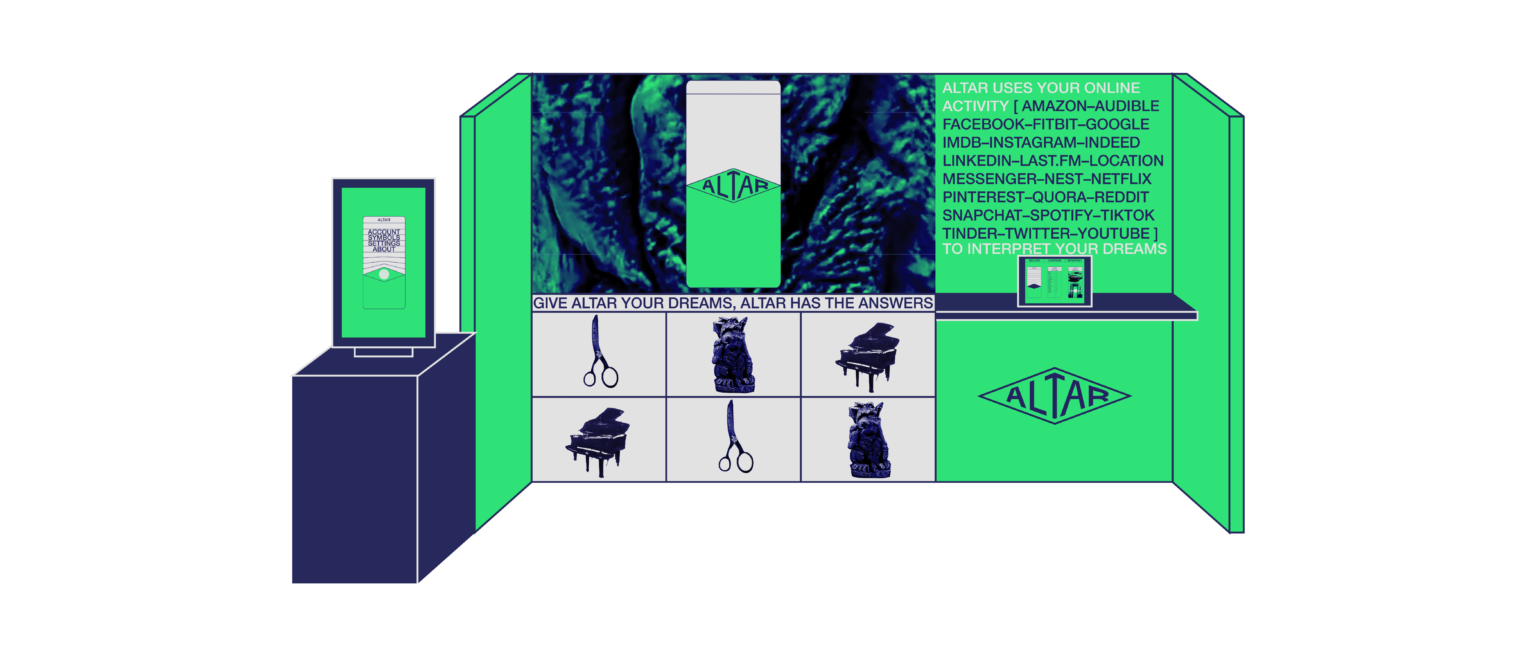 A satirical speculative dream decoding and documentation app in the year 2027 that uses your online activity to analyse and decode your dreams. Simply awake, record your dreams, and ALTAR will do the rest. Using your dream audio recordings, ALTAR compares your dream and online activity to find patterns, helping you gain personal insights into your waking life. Along with decoding your dream symbols, ALTAR gives you a digital recreations of each dream symbol, generated using a neural network, mimicking how dreams are made through stitching together various memories.