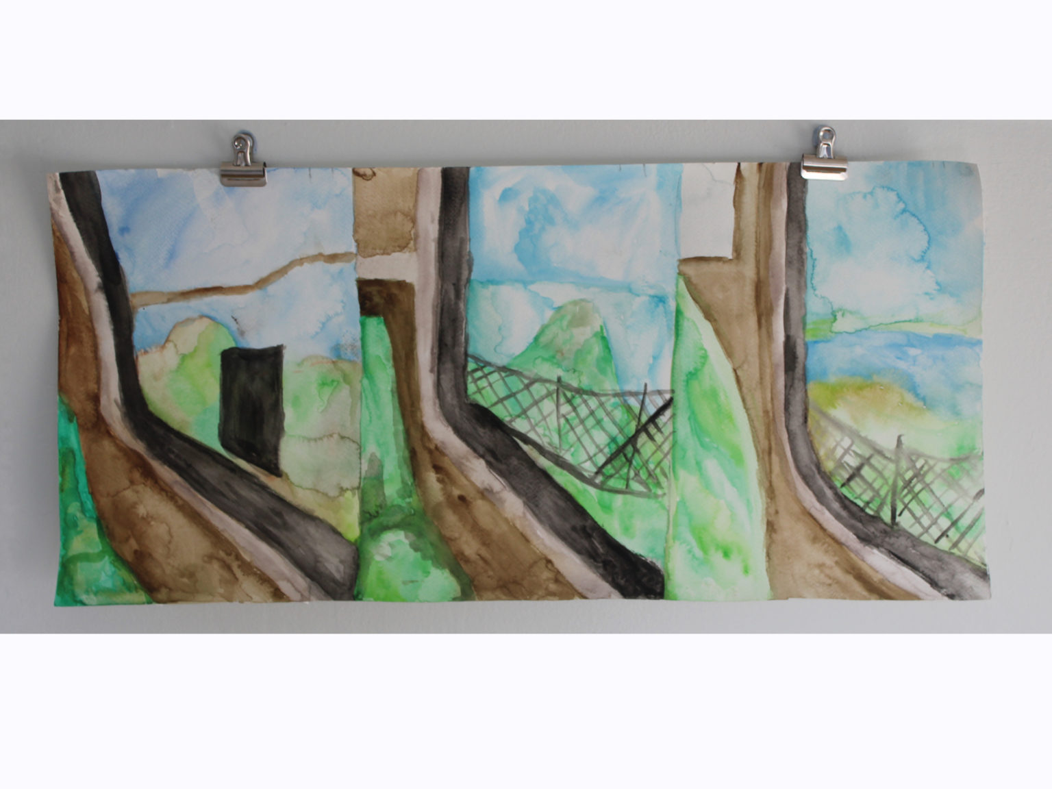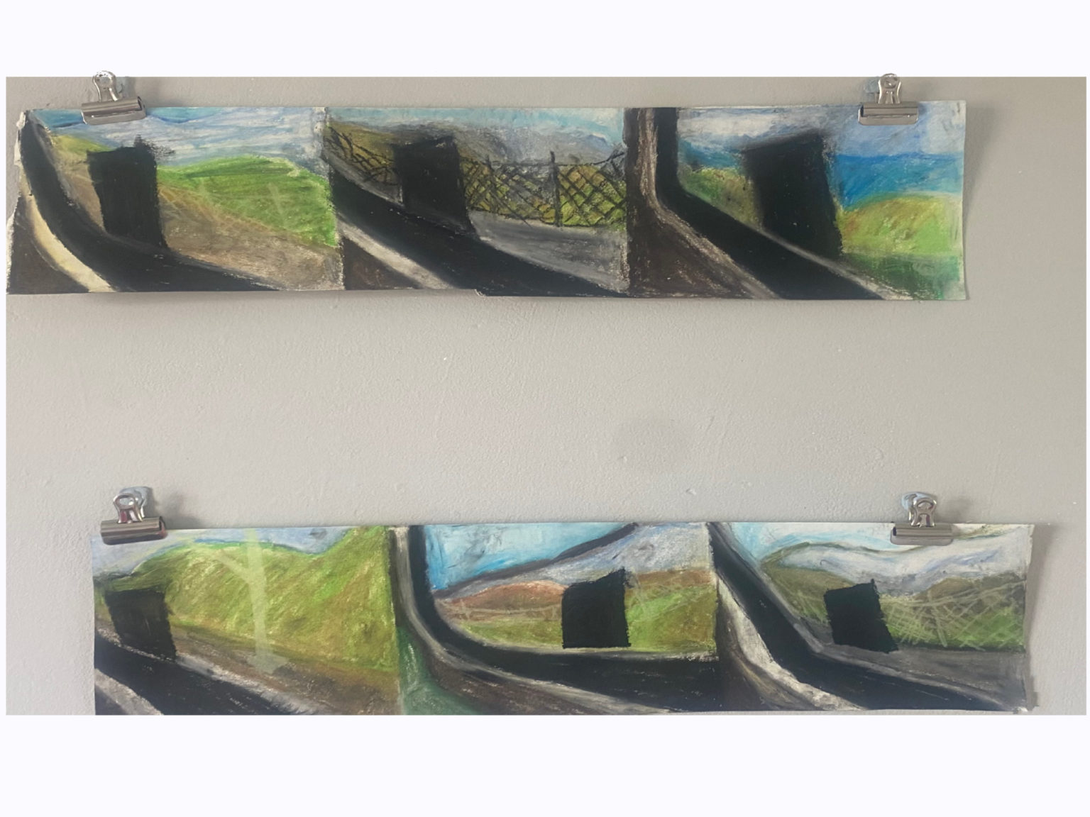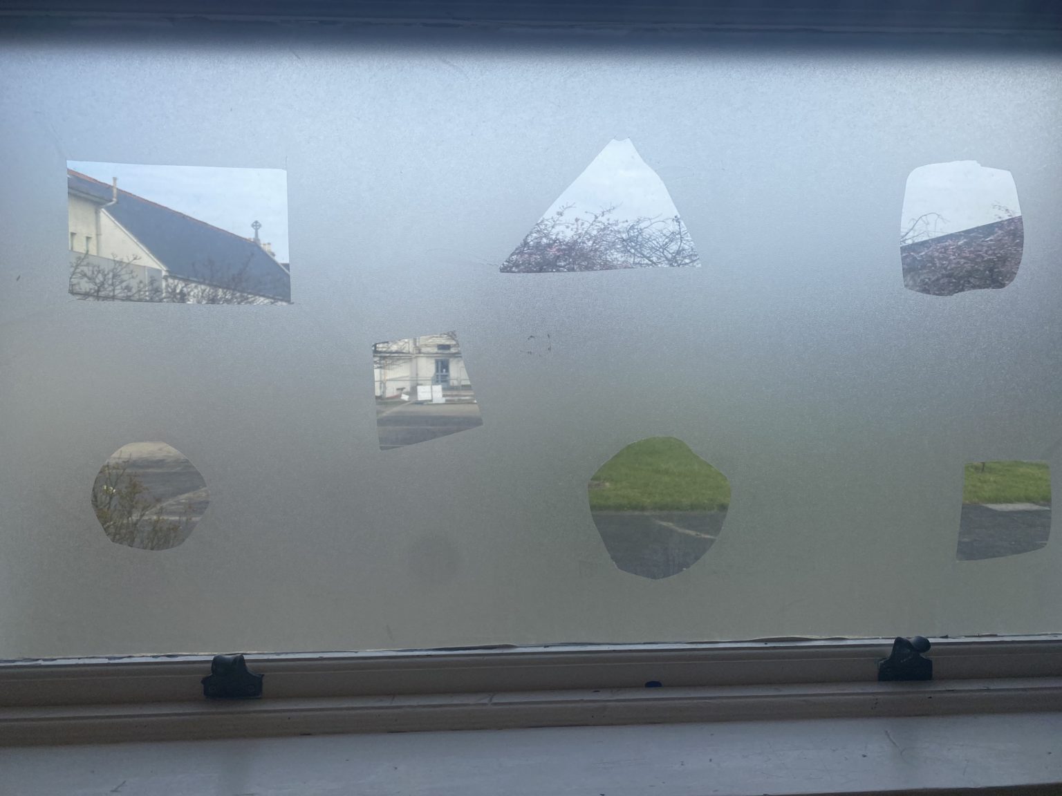 My project involves working with viewfinders in a range of contexts and locations. For example, I have installed site-specific viewfinders on the windows of IADT corridors. I have also developed work in response to the experience of travelling by train from home to college and back. I install a temporary viewfinder on the train window and try to capture the moving world within the frame. I also photograph what I see and these photos are used as research sources for my prints and paintings. Working in this way allows me to break down the view into smaller areas so that I can better understand the lines, forms, and colours. I am interested in drawing attention to natural and everyday environments that are often overlooked on these journeys. The act of installing the viewfinders on the train, so they are visible to other travellers, is a key part of the project.