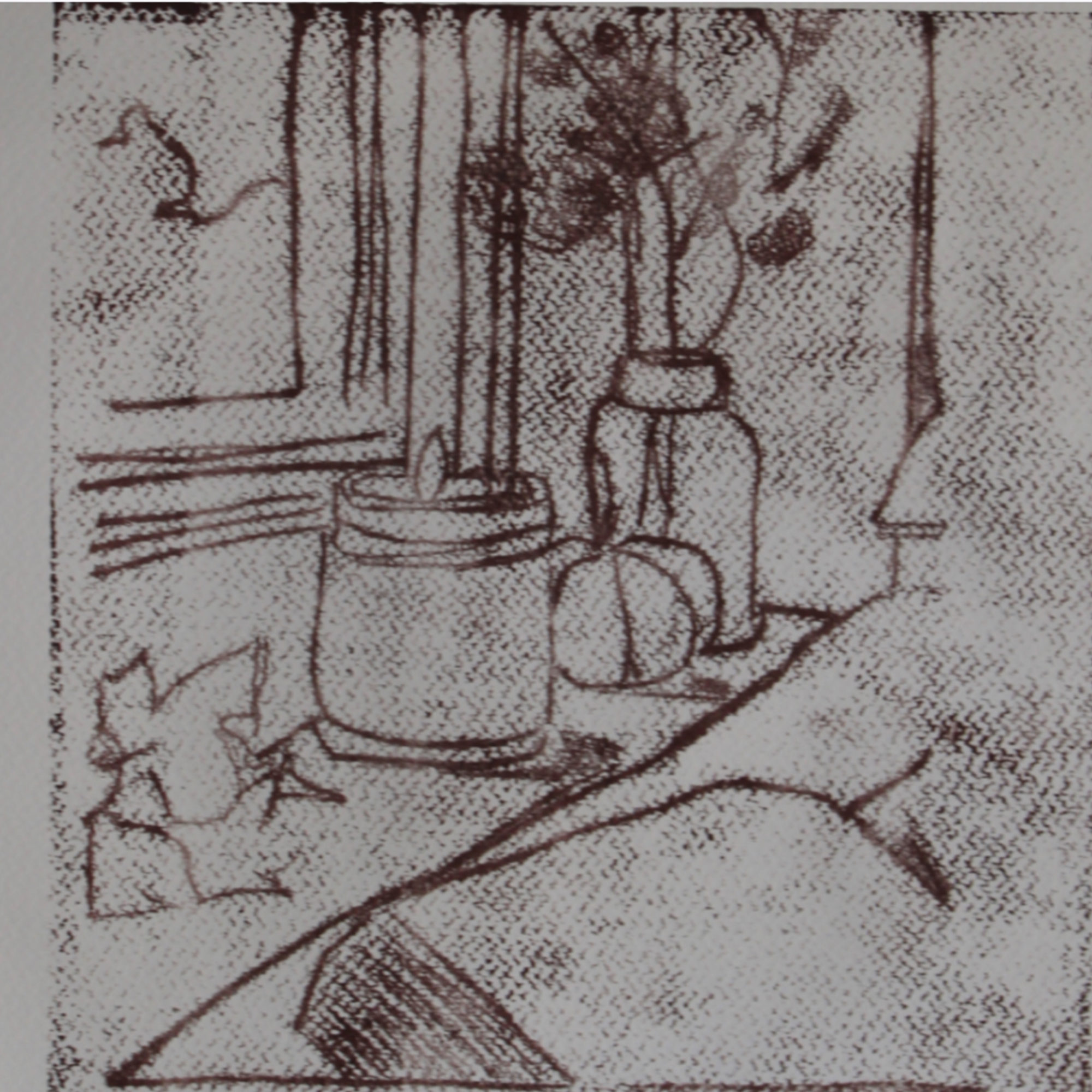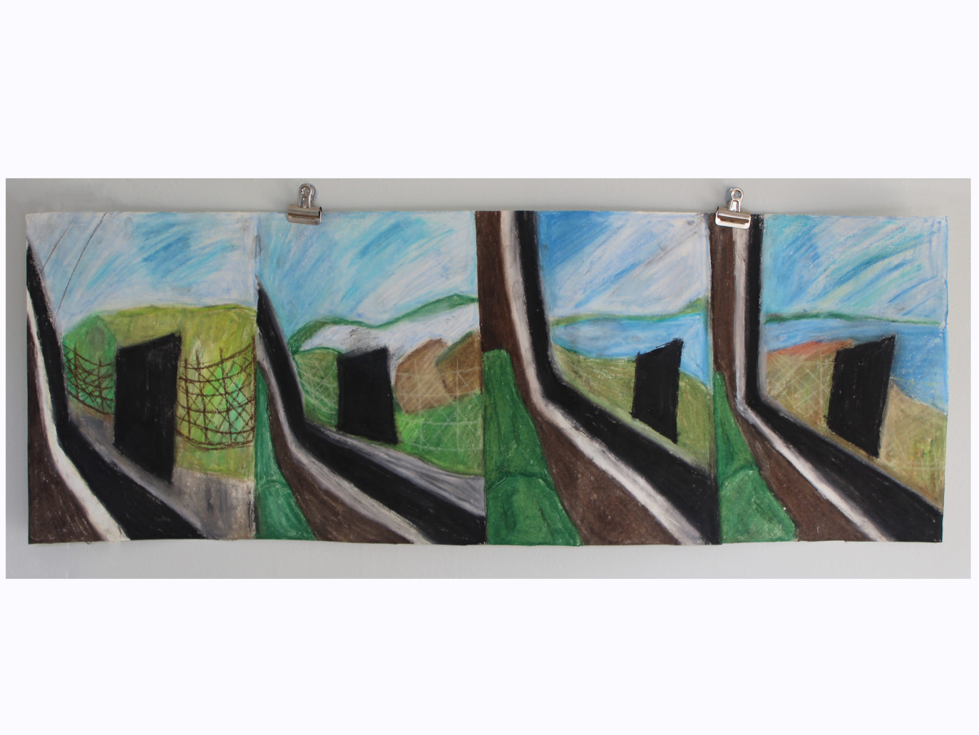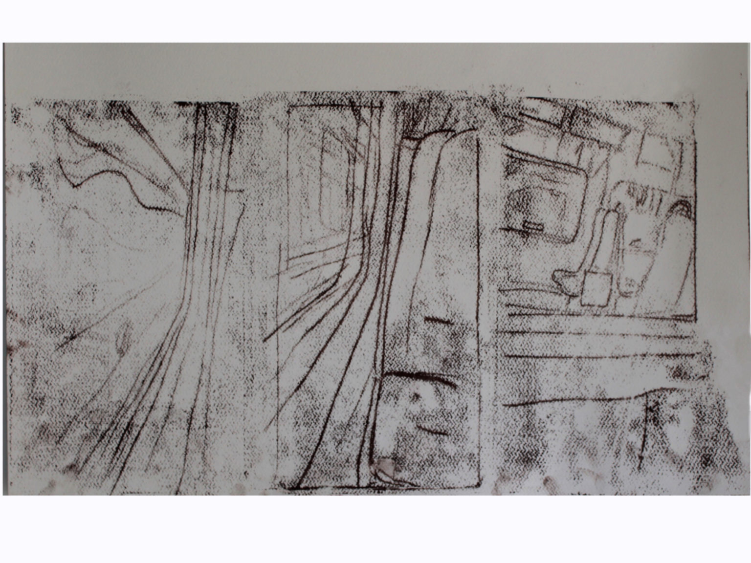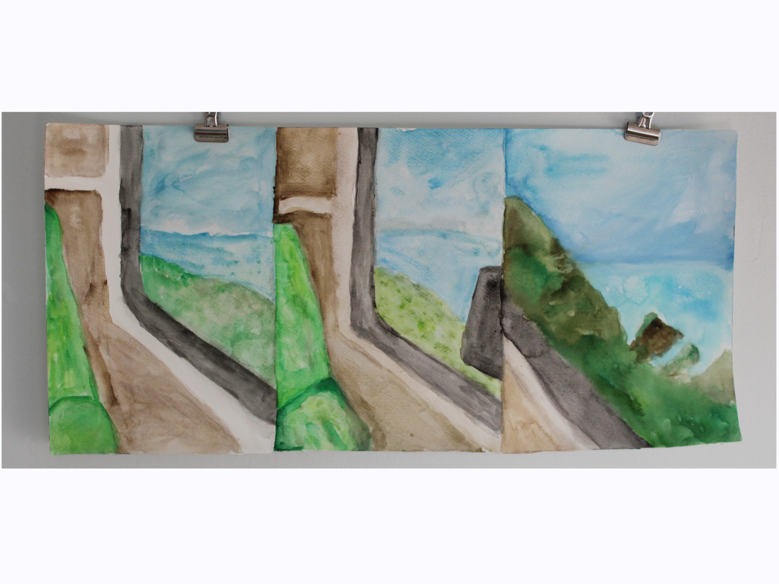 My project involves working with viewfinders in a range of contexts and locations. For example, I have installed site-specific viewfinders on the windows of IADT corridors. I have also developed work in response to the experience of travelling by train from home to college and back. I install a temporary viewfinder on the train window and try to capture the moving world within the frame. I also photograph what I see and these photos are used as research sources for my prints and paintings. Working in this way allows me to break down the view into smaller areas so that I can better understand the lines, forms, and colours. I am interested in drawing attention to natural and everyday environments that are often overlooked on these journeys. The act of installing the viewfinders on the train, so they are visible to other travellers, is a key part of the project.