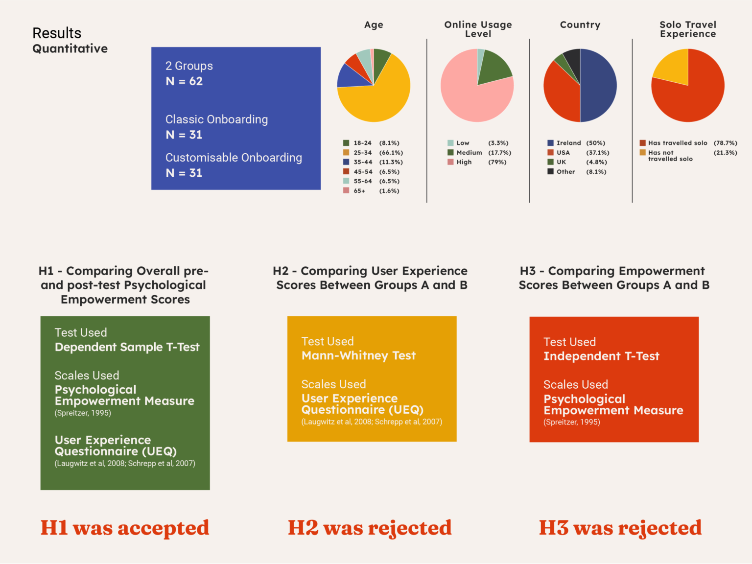 Solo travel is a transformative experience for women, leading to self-discovery and feeling empowered, enriched, brave, free, and in control. Even still, the female solo travel experience has barriers and constraints. Loneliness, safety and security, lack of confidence, and fear of social stigma have been identified as barriers that keep women from fully enjoying, or even being completely deterred from, travelling alone. This study further explored the factors that enhance and hinder the female solo travel experience, as well as investigated if the UX design of a mobile application can influence a user’s feeling of empowerment and, more specifically, help women have a more enriching and transformative solo travel experience. A group of 62 participants completed usability testing to determine if implementing empowering UX principles into the design of a mobile application and giving users choice and control in the form of customisable onboarding affected their feeling of empowerment and their overall user experience.