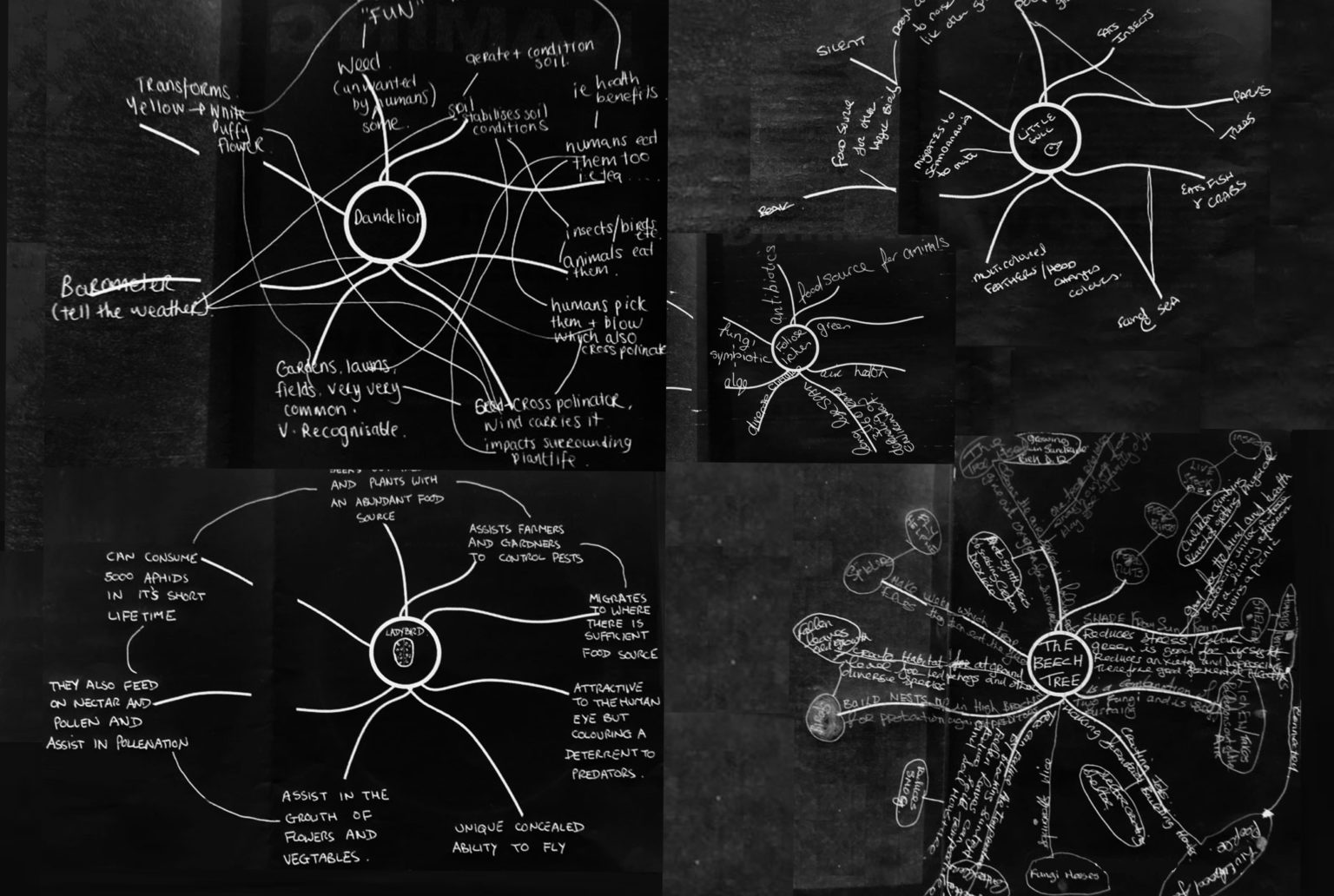 The process begins with a grounding in ideas and theories to challenge our thinking. We then set out to explore our more than human environments and we used wayfaring (Ingold) as a method for gathering new knowledge and refocusing our awareness. Mapping is used as a way of understanding the meshworked nature of our more than human worlds. Here we mapped out the relationships, connections and points of interaction that make up our complex interwoven environments. We looked then to challenge our western understanding of how things of this world are classified and drawing from folk taxonomies and indigenous ways of knowing, we set out to create new names for our more than human actors. The names we create aim to capture storied knowledges (Ingold) that can offer “real information about the ecological relations in the world” (Sinclair). Our final exercise is storytelling. We used storytelling as a tool for reflection, and as a container and communicator of the knowledge we gathered.