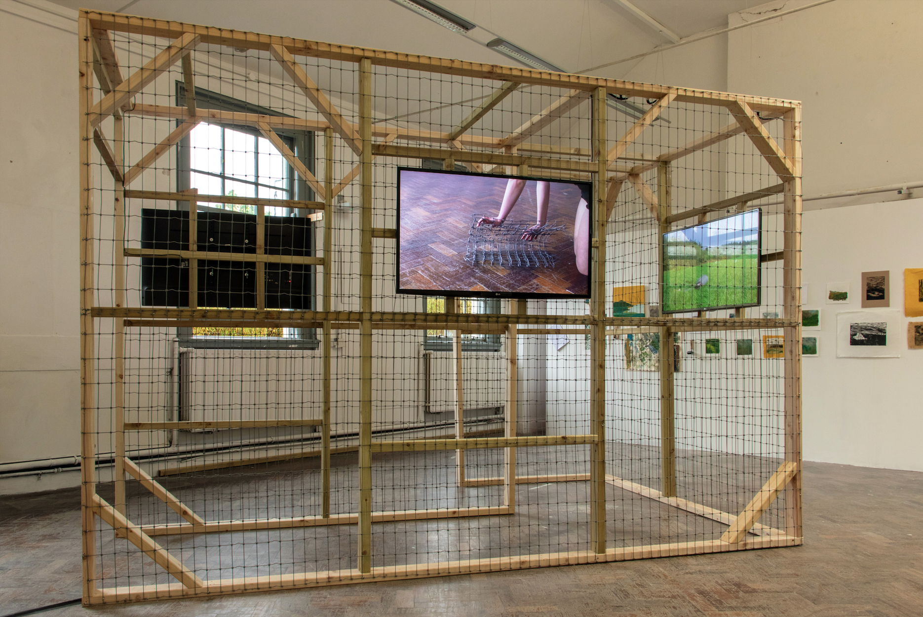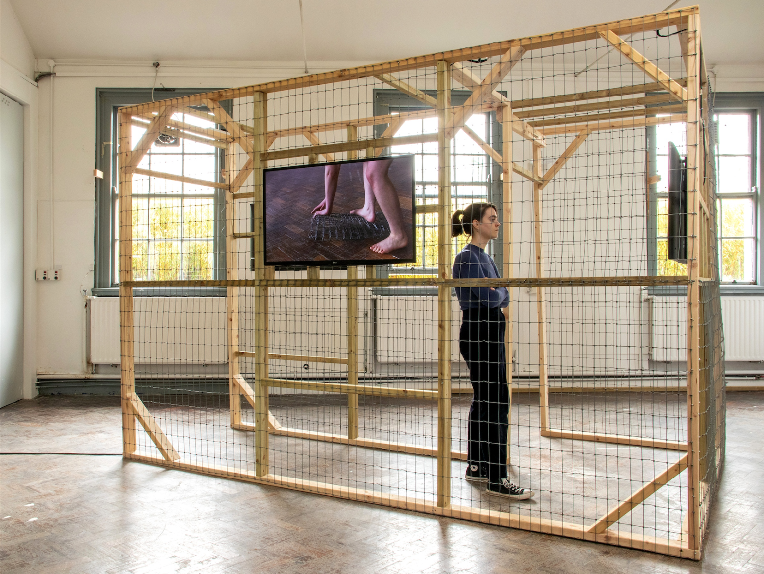 Tara James investigates industrial labour in relationship to masculinity, rural living and queer identity. Their project is driven by self-determination and the refusal to be undermined by Irish cultural ideals of masculinity, which are often framed by participation in hard physical labour. In response to their own words, thoughts, and memories, they write poetry and combine text with archival images in order to generate performative ideas. The artist pushes the limitations of their body in order to demonstrate queer exhaustion - the experience of having to prove yourself, your identity, and your abilities in spite of gendered assumptions and expectations. They use their own body as a tool to explore these concepts, and respond to disregarded materials found on their father's worksite (aka the back garden). By interacting with materials, such as timber posts, wooden palettes, and steel wire mesh, their body becomes a site of resistance.