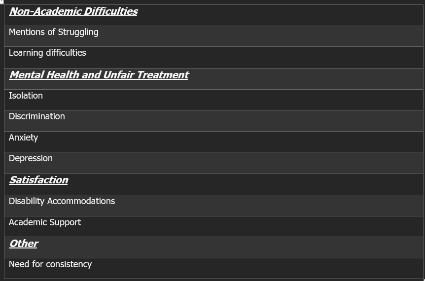 My thesis aims to help provide both information and insight in these student’s lived experiences through the examination of online forum posts on the various experiences of students both past and present in the areas of academic and non-academic environments it also set out to discover if discrimination played a role in reduce the efficacy of sustained communication of SST from the student’s experiences.