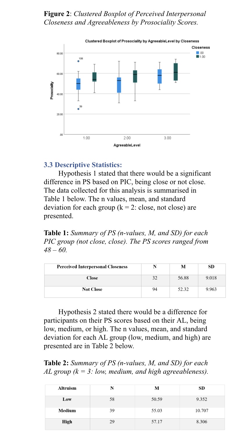 The aim of the present study was to investigate the influence of perceived interpersonal closeness (PIC) and altruism (AL) on prosociality (PS) towards immigrants in an Irish context. The main results of the research were that high levels of AL, as well as perceiving immigrants as ‘close’ interpersonally, appear to have positive effects on PS towards migrants in Ireland. Hypothesis 1 stated that there would be a difference for participants on their PS scores based on their PIC. This hypothesis was accepted as a strong result was gleaned, supporting the findings of previous literature. Hypothesis 2, stated that there would be a difference for participants in the PS scores based on their level of AL. This was accepted, though it gleaned a weaker result than Hypothesis 1. Participants' AL was measured through the Big Five personality trait of Agreeableness. A post hoc analysis indicated that a significant difference in PS exists between the low and high AL groups.