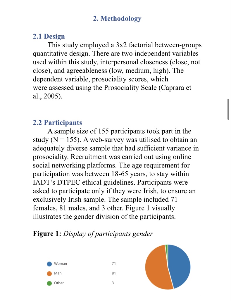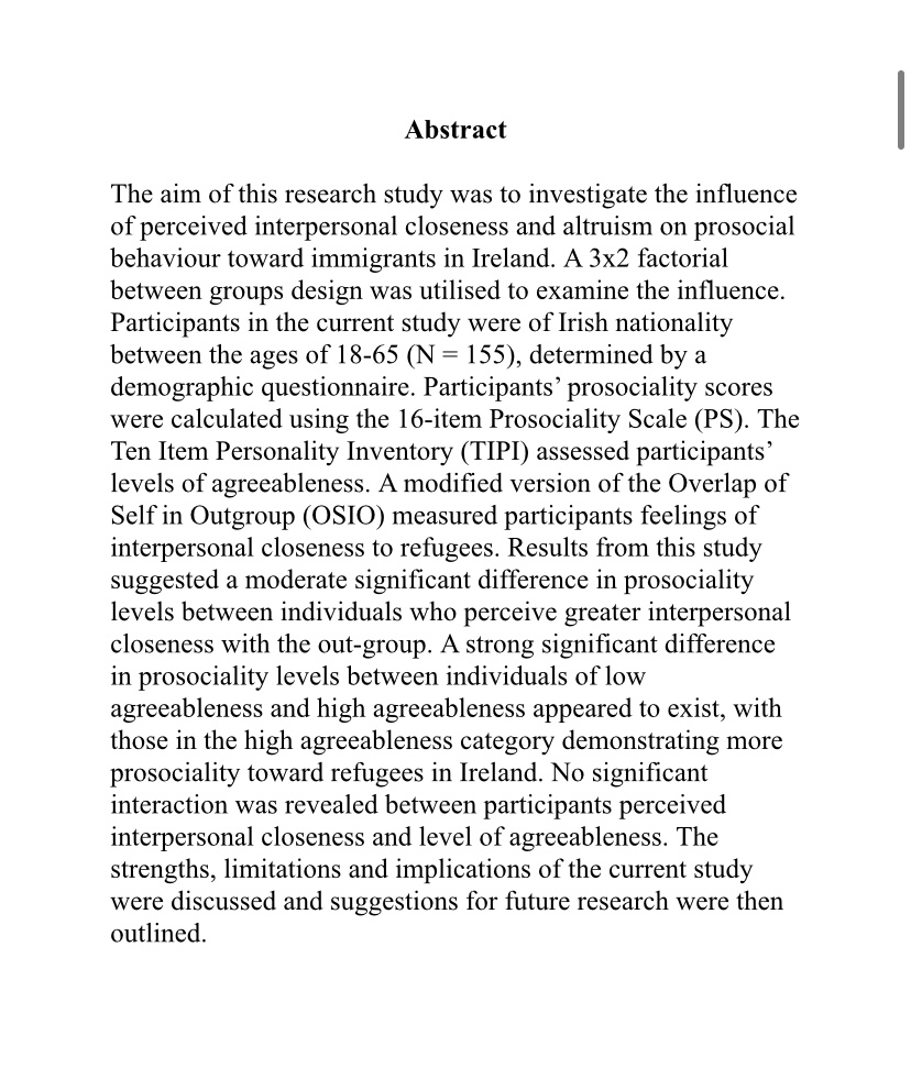 The aim of this research study was to investigate the influence of perceived interpersonal closeness and altruism on prosocial behaviour toward immigrants in Ireland. A 3x2 factorial between groups design was utilised to examine the influence. Participants in the current study were of Irish nationality between the ages of 18-65 (N = 155), determined by a demographic questionnaire. Participants’ prosociality scores were calculated using the 16-item Prosociality Scale (PS). The Ten Item Personality Inventory (TIPI) assessed participants’ levels of agreeableness. A modified version of the Overlap of Self in Outgroup (OSIO) measured participants' feelings of interpersonal closeness to refugees.