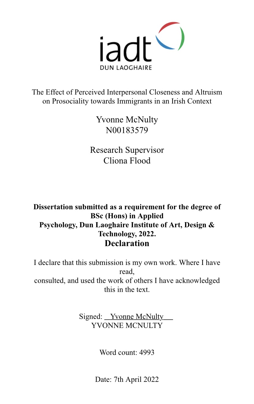 Hey there! My names Yvonne McNulty, and I’ve just completed the BSc Applied Psychology course at IADT. I hope to continue on my studies to work in the realm of psychotherapy one day. I decided to conduct my research project on attitudes towards migrants in Ireland, as it is such a prevalent topic in our society at the moment. I learned a huge amount carrying out this study, hope you enjoy!